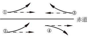 4、单选题 如下图,虚线箭头表示水平运动物体的原始运动方向,实线箭头表示受地转偏向力影响后实际的运动方向,中所示四种情况,正确的是( )
