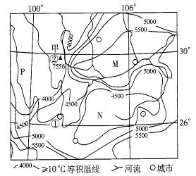 (2)M地? 5 500~6 000℃。N地? 4 000~4 500℃。? M地为四川盆地,海拔低,N地为云贵高原.海拔高。(3分)