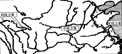 (1)东线方案主要缓解我国水资源短缺的________地区的用水紧张状况。图中A、B、C各段水道中能够自流输水的是________段。