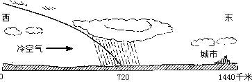 本题解析:此题主要考查锋面对天气的影响。根据图中冷气团的移动方向,知道该锋面是冷锋。根据锋面的移动速度可以计算出锋面到达城市上空的时间:(1440—70)30=24(小时),即次日14时左右移到该城市上空。未来48小时的天气变化,即冷锋过境前、过境时、过境后的天气变化,冷锋过境前后,气温、气压变化剧烈,老人、婴儿不适应。