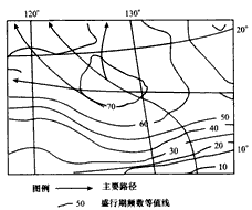 4、单选题 读“某地理现象移动路径和盛行期频数等值线图”,回答(1)——(3)题。
