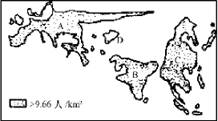 4、综合题 为了揭示世界人口的分布状况,著名学者邦奇等创建了人类大陆图。在地图上取消陆地和海洋,仅画出人类密集的地区,面积较大的人类密集区称人类大陆。世界上共存在四个人类大陆:第一个为东亚和东南亚;第二个是南亚;第三个是欧洲;第四个是北美东部。下图为世界人类大陆图的一部分。读图回答下列问题。