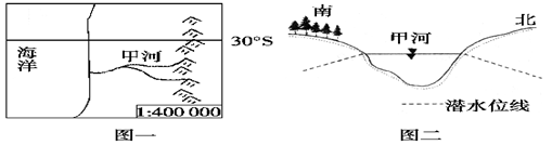 【小题1】根据图一可知,甲河位于南半球地中海气候区。A为北半球地中海气候,B为南半球地中海气候,C为亚热带季风气候,D为温带海洋性气候。