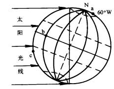 【小题1】图示晨昏线与经线重合,表示春分或秋分日,太阳直射点的纬度为0°,太阳直射点的经线为12时所在的经线,根据图示晨线与赤道的交点时间为6时,经度为60°W,计算直射点的经度为30°E。