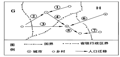 小题3:图示G国的人口迁移,从乡村向城市,且为国际人口迁移的主要迁出国,故判断为发展中国家,而H国的人口迁移,出现城市向城市、乡村向乡村和城市向乡村的人口迁移,且为国际人口迁移的主要迁入国,故判断为发达国家,故结合选项只有D项正确。