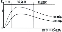 5、单选题  一个城市制造业就业密度与服务业就业密度的比值,通常用R值表示。下图示意我国某特大城市2000年和2010年R值随距市中心距离的分布曲线,读图完成问题。