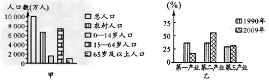2、单选题 下面甲图表示我国某省2009年各年龄阶段人口数量构成,乙图表示该省三大产业的比例变化。据图完成1—2题。?