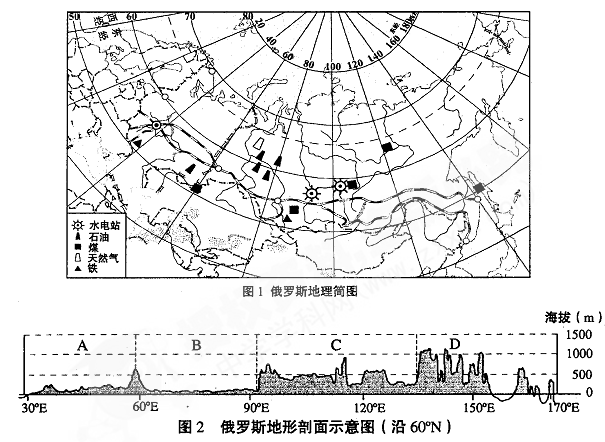 (1)在“俄罗斯地形剖面示意图”上,字母A、B代表的地形区名称分别是________________;字母c、D代表的地形区名称分别是______________________________________________。据此判断,俄罗斯地形的东西分界线是_____________河。
