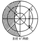 4、单选题 读下图所示阴影部分表示7月6日,此时北京地方时为10时44分。读后回答(1)——(3)题。
