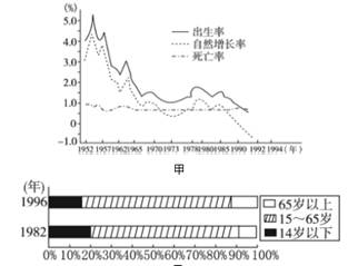4、综合题 读“上海市人口出生率、死亡率及自然增长率图”(图甲)和“1982年与1996年上海市人口年龄构成比较图”(图乙),完成下列问题。