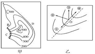 小题1:图中若甲图为某山区等高线地形图,且该地多岩崩和泥石流等地质灾害,图中最易发生泥石流灾害的地点是B地。因为B地等高线向高处凸,凸高为谷,即B地处沟谷地带,最易发生泥石流。