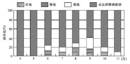 1、综合题 (10分)[自然灾害与防治】下图为浙江省风暴潮高潮位达到各警戒级别比例逐月分布图,其中红色、橙色和黄色代超过当地警戒水位由高到低变化。据图归纳浙江省风暴潮高潮位超警戒潮位的时间分布特点,并提出防御措施。?