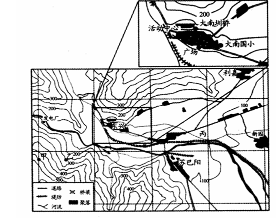 小题1:根据已知条件“图中每个正方形网格的实地面积为4平方千米”可知正方形边长为2千米,甲乙两地图上距离约为半个边长,故实际距离约为1千米;读等高线可知,甲地高程50米、乙地250米,两地垂直高差为200米。根据坡度定义“坡面的垂直高度与水平宽度的比”可以计算两地坡度最接近20%。正确答案选D。
