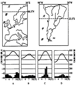 (2)B;因为a地属温带海洋性气候,(或答a地年降水量分布均匀,年温差较小)。(3分)
