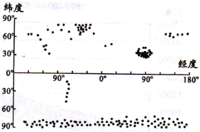 2、单选题 该图中黑点表示某资源的主要分布区。读图回答下面2题。