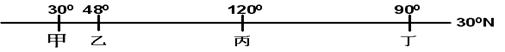 小题1:根据图示的经纬度位置判断,甲为尼罗河河口;乙为阿拉伯河河口;丙为钱塘江河口;丁为密西西比河河口,由于尼罗河流经热带草原地区和热带沙漠地区,故河流的年径流量变化最大。