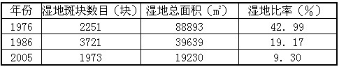 1、综合题 某区域内湿地呈斑块状分布。下表中的数据反映该区域湿地的变化。阅读资料,分析该区域不同时段湿地变化的特点,说明湿地变化对环境的不利影响。