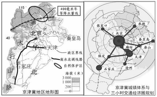 材料一:“京津冀地形图”与京津冀城镇体系与三小时交通经济圈规划图”