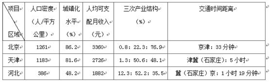 (5)试分析解决京津冀三地社会经济发展的不平衡问题、促进京津冀一体化发展应该采取的措施。( 8分)