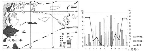 (1)甲地位于地中海沿岸,属于地中海气候。该气候类型的特点是夏季高温少雨,冬季温和湿润。结合甲地的气候资料图,可以看出该地夏季温度高,冬季温度在0℃以上;降水有明显的季节性,夏季降水少,冬季降水多。