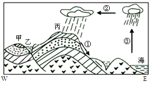 (2)由于甲处是向斜,向斜是良好的储水构造,在此地建设隧道,易发生隧道积水现象;丙处是背斜,岩层向上隆起具备良好的支撑力作用,所以修建地下隧道在丙地适宜。