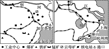 2、综合题 下图为印度的乔塔那格浦尔工业区和中国的沪宁杭工业区。读图回答下列问题