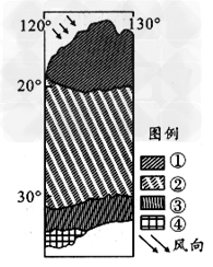1.当图中北部地区受图中所示盛行风影响时,①②③④气候区正值多雨时节的是