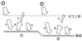 2、单选题 图中,①②两地纬度相同,①地海拔高于②地,各箭头表示不同的辐射形式。读图回答2~3题。