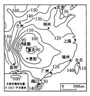 2、单选题 读我国太阳年辐射总量分布局部图。