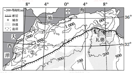 2、综合题 (10分) 古代阿拉伯人把今突尼斯、阿尔及利亚和摩洛哥所在地区统称为马格里布地区。下图为马格里布地区示意图。阅读图文材料,回答下列问题。