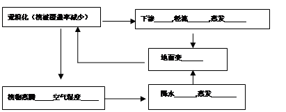 本题解析:(1)由于植被具有涵养水源、保持水土的基本功能,故植被破坏而导致下渗减少,则地表径流量加大;蒸发减弱;由于植被的涵养水源能力下降,故地表径流的速度加快,地面变得更干燥,植被减弱,则植被的蒸腾作用减弱,则空气湿度降低,故降水量减少,蒸发量加大,注意各个因素之间的相互联系性分析。(2)亚马逊河流域由于大面积的毁林而导致了植被覆盖率下降,故影响了植被的蒸腾作用和空气湿度,进而导致了降水量减少。(3)我国西北地区荒漠化的主要人为原因即植被的破坏和水资源的不合理利用分析。