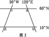 2.可以画出另外一幅实际的经纬网图(图2),ab和cd线对调位置,从图2上可知a在d的东北方向,cd线经度为30°W。