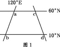 本题解析:1.可以画出实际的经纬网图(图1),从图1上能读出四条线间的长度关系是:ab=cd,bd>ac,ac≈(1/2)×cd(60°纬线周长约是赤道的一半,赤道上50个经度的距离和50个纬度的距离相等)。