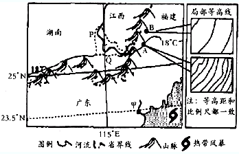 【小题1】结合图右侧A、B两地的等高线图分析,B地等高线比A地更为稀疏,说明坡度较缓,物质迁移速度慢,水土流失少,土壤厚度大,土壤肥力高。B温度略低,蒸发较少,土壤水分条件好。A地温度较高,蒸发较多,土壤水分条件较差。所以B地植被更茂盛。
