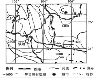 本题解析:【小题1】本题考查区域等值线的判读。第11题,读图C城市的日照时数大约为1200,A城市的日照时数大约为2400,故大约相差1200。