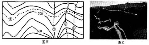 1.若图甲所示地区有古长城经过,你认为最可能的线路是2.若在图甲所示地区修建公路,最合适的线路是