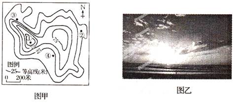 4、单选题 2014年元旦某学校地理兴趣小组到福建省某无人海岛进行野外考察活动。下图为该岛等高线地形图和下午拍摄的太阳照片,读图甲、乙回答下题。