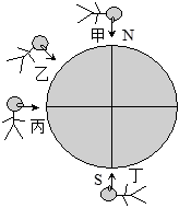 小题1:若图中的球是地球,则甲乙丙丁四人看到的地球自转线速度最快的是(?)