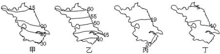 小题1:根据该省的轮廓形状可以判断该省是我国江苏省。江苏省位于我国东部沿海地区,属于季风气候,受来自海洋的夏季风的影响,夏季降水多,冬季受来自陆地的冬季风的影响,降水少;因而,夏季降水占全年降水量的比重最大,四图中,乙图反映了降水在全年的比重最大,应为夏季。甲图应为春季(江苏春雨较多,且全省南北降水差异较大),丙图应为秋季,丁图应为冬季(江苏冬季降水最少)。