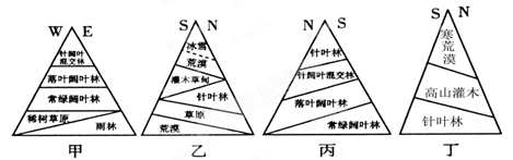 1.当甲地西坡山麓植被一片枯黄时,甲、乙、丙、丁四地昼长由长到短的正确排序是2.若乙表示我国天山,则南坡缺少森林带的主要影响因素是