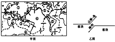 5、单选题 读板块分布示意图(甲图)及板块碰撞示意图(乙图),回答下面问题。