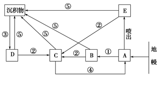小题2:组成岩石圈的三大类岩石,D为沉积岩,B为侵入型岩浆岩,E为喷出型岩浆岩,A为岩浆,剩下C只能为变质岩,则指向变质岩的箭头②表示的是变质作用。