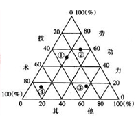 小题1:三轴坐标的读图应以每条横坐标的原点位置,确定相应的纵坐标,以与纵坐标平行的原则读数,故①工业的技术比重约30%;劳动力投入比重约50%。