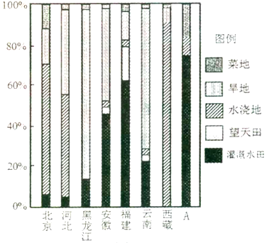 2、单选题  水浇地是指除水田、菜地外,有水保证和灌溉设施,在一般年景能正常灌溉的耕地。望天田是指无灌溉工程设施,主要依靠天然降雨种植水生作物的耕地。下图示意我国部分省区耕地利用结构。读图回答下列小题。