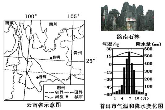 4、综合题 云南省,地处我国云贵高原,喀斯特地貌显著;夏季受到东南季风和西南季风的影响,降水丰沛。读下图,回答下列问题。(28分)