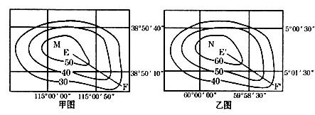 小题1:本题考查地球表面的距离估算。甲图相邻两条纬线间隔30″,乙图相邻两条纬线间隔1′,所以乙图实际距离大,乙图实际范围大;甲乙两地相对高度相同,但甲图实际范围小,所以EF之间坡度大。所以本题选择D选项。