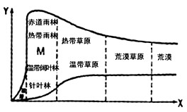 小题2:热带草原是由赤道低气压带和信风带的交替控制形成,我国内蒙古高原的草原主要是深居大陆内部,海洋水汽很难到达,降水较少而形成,选项A错;图中阔叶林为热带雨林,选项B正确;图中荒漠带是由副热带高气压带常年控制,气流下沉,降水稀少,蒸发旺盛形成,选项D错。