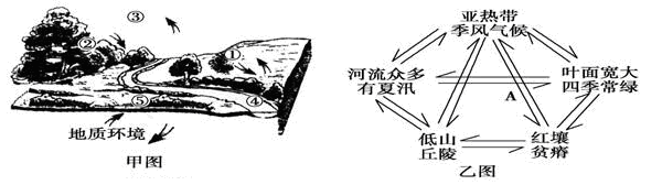 小题2:不同的气候条件下,形成不同的土壤,乙图中的A环节,反映的是在亚热带季风气候条件下,高温多雨的环境中,有机质被分解的快,最后形成的土壤,是一种黏性的低产土壤,C对。A环节反映的是土壤形成的气候条件,不是气候特征,A错。植被破坏严重与气候无关,是人类活动造成的,最终导致荒漠化,B错。A环节不能表现出河水数量多少,流量大小,D错。