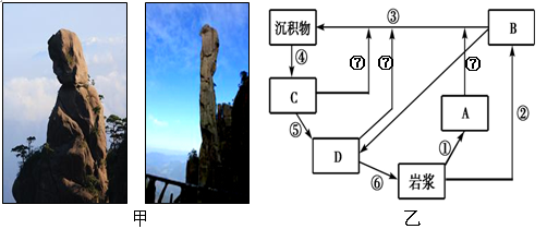 5、单选题  “东方女神”、“巨蟒出山”(如图甲)是江西三清山标志性景观,该景观为花岗岩山岳地貌。图乙为“地壳物质循环示意图”,读图完成下列小题。