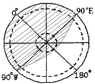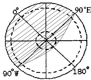 (5)此刻,赤道和晨线的交点的经度为20°W,所以,赤道上白昼的范围为20°W向东至160°E,此经度范围正好是东半球的范围。